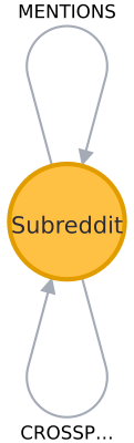 This shows that our graph is, indeed, quite simple. It only has one kind of node (Subreddit), and subreddits are related to each other either through mentions or crossposts. Since Neo4j, like many other NoSQL databases, is schemaless, this command is especially useful when familiarizing yourself with the structure of a new graph.