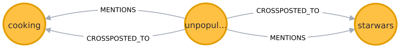 The resulting path shows us that the subreddit unpopularopinions references both the cooking and starwars subreddits — not surprising, as there are surely unpopular opinions in both communities. Since we included the title property on all relationships, you can hover over any of the relationships in your browser to see an example of what post contained a reference to the other subreddit.
