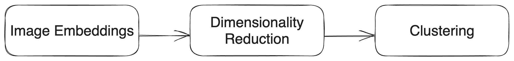To keep the intricate details of the high-dimensional CLIP embeddings while making clustering meaningful, we can use dimensionality reduction techniques such as PCA or UMAP. These methods shrink the embeddings into a simpler (i.e., lower dimensionality) form that traditional clustering methods can handle better. This way, we balance between capturing the data's complexity and making clustering work effectively in a more manageable space. A high level architecture of the clustering approach, including dimensionality reduction, is depicted below.