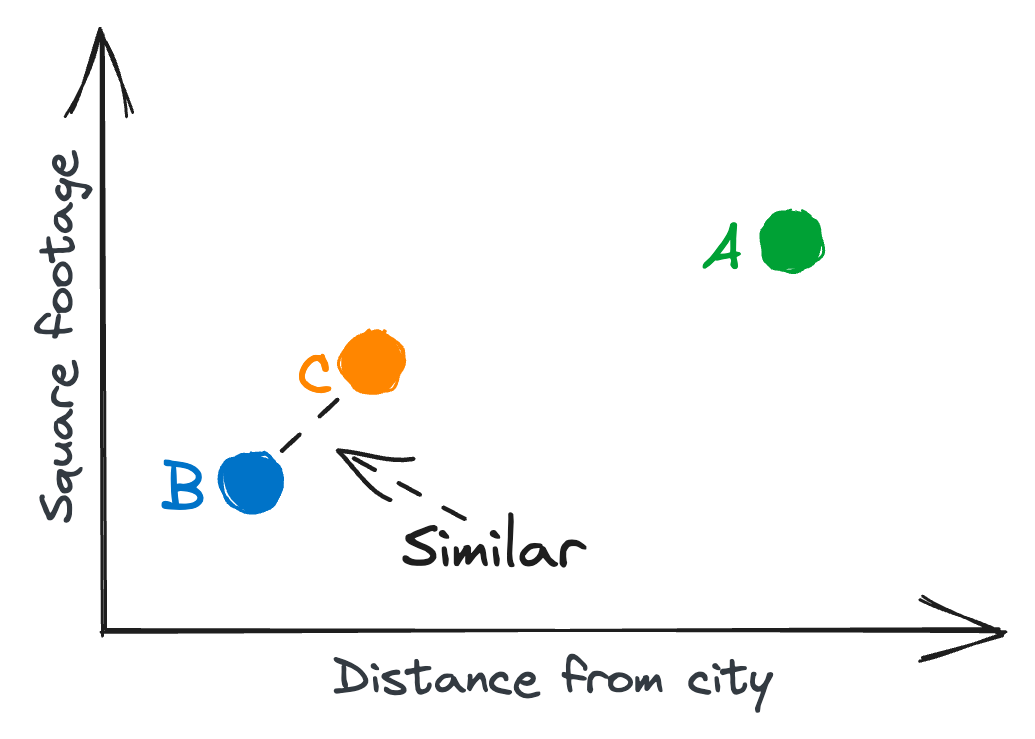 To understand this phenomenon, imagine you are tasked with clustering houses based on two variables, e.g., square footage and distance from a nearby city. You could easily draw this two-dimensional representation, and use the line distance between points as a similarity measure, as illustrated below.