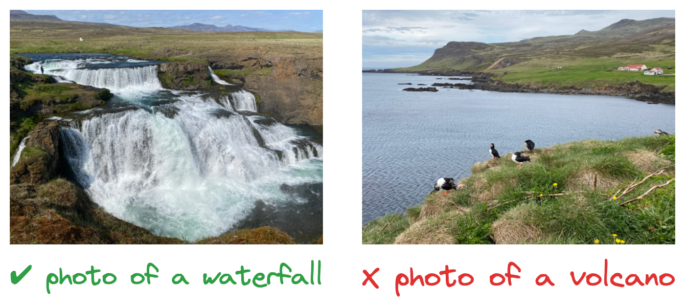 As seen in the visualization, the two waterfall images on the left are proximate to one another in the embedding space, just as the iceberg and glacier images on the right. In a more general sense, any pair of images from a collection can be taken, and their similarity can be quantified. This ability is what enables us to cluster images.